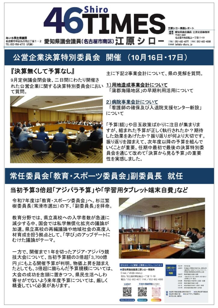 大会経費総額(3,700億円)が判明したアジア・アジアパラ競技大会や来年度のタブレット自費購入問題などを報告。タブレット問題は、中学3年生のお子さんをもたれたお父さんから具体的な要望をいただきました。しっかりと県教育委員会へお繋ぎします。